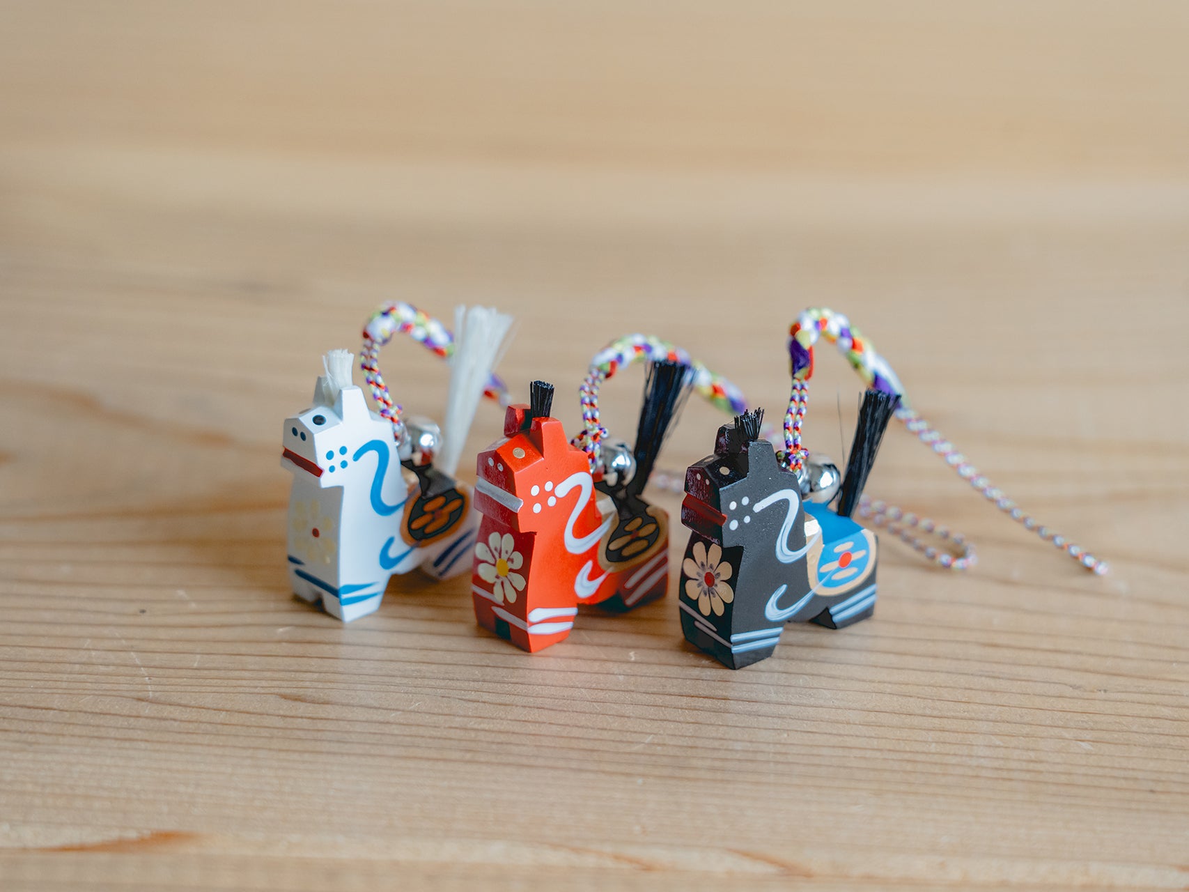 大正の末期には、直線加工を得意とするナタを使いながらも、胸や腹部分の巧みな曲線加工と、華やかな模様で作られた八幡馬は、三春駒(福島)、木下駒(宮城)と共に日本三駒と呼ばれるようになりました。