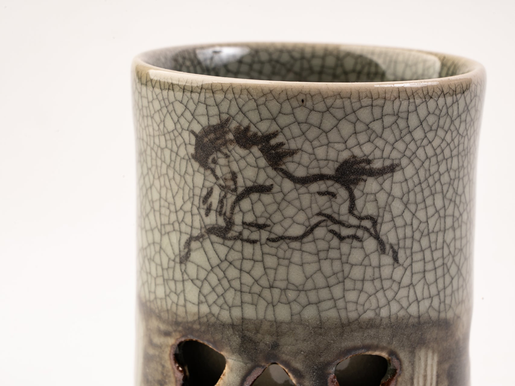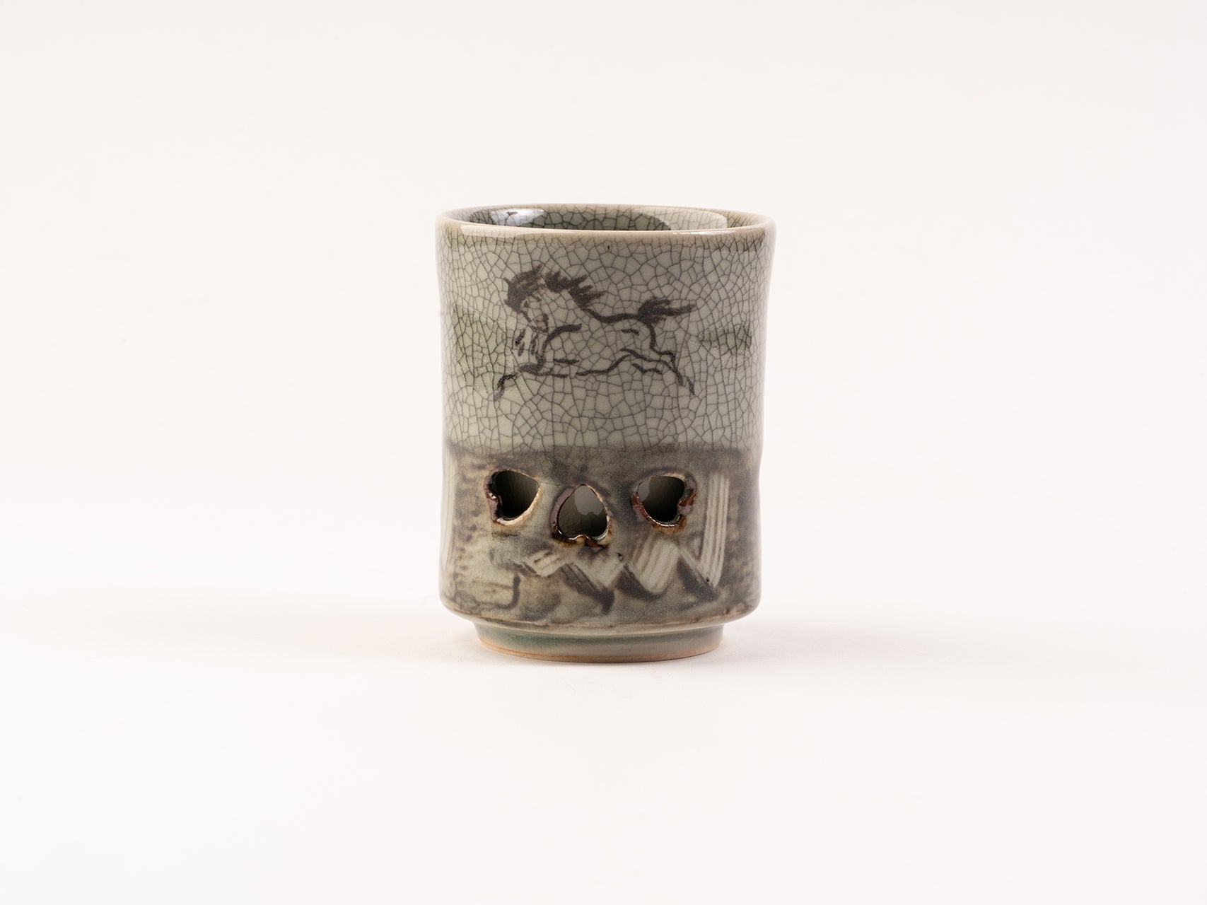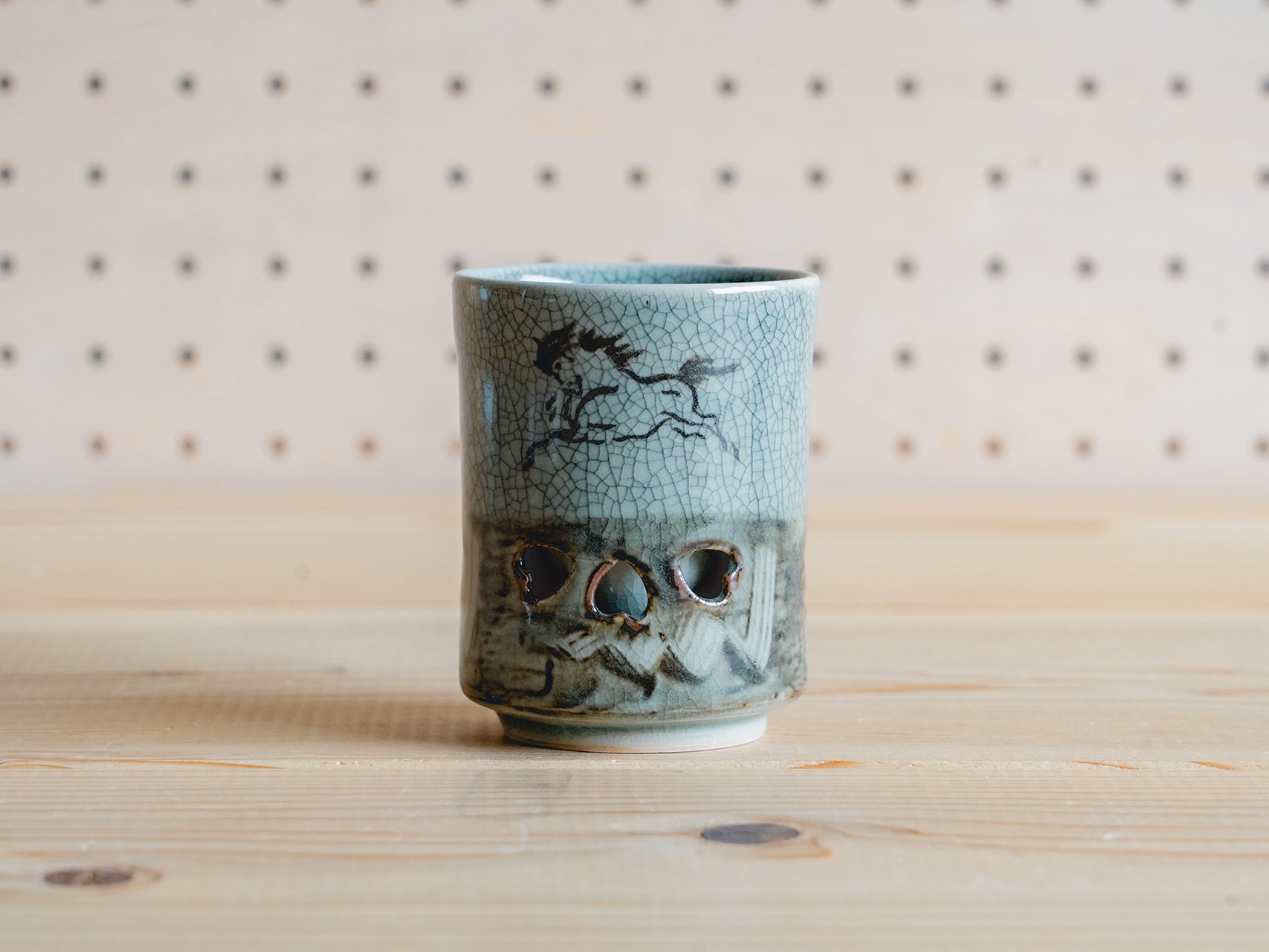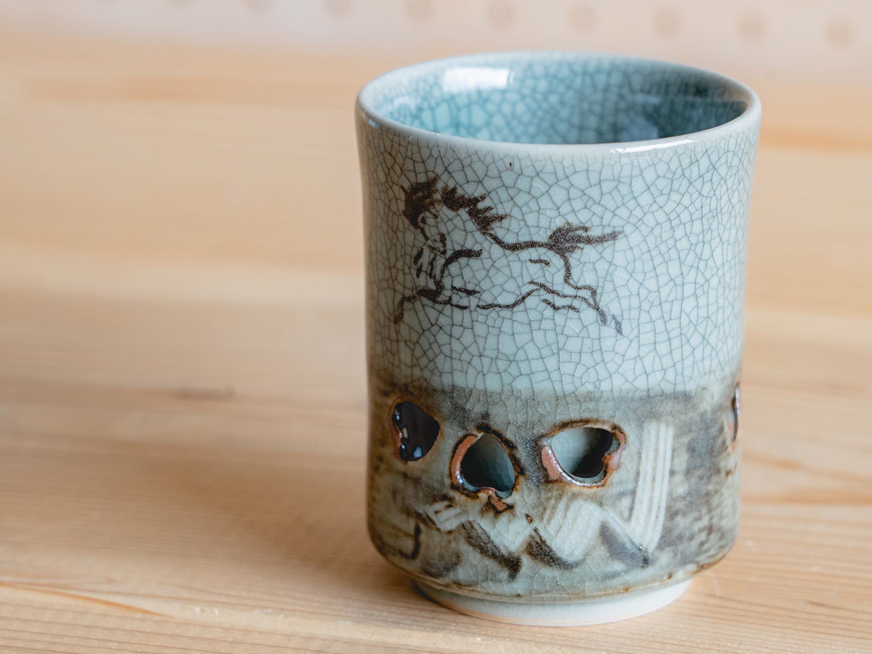 大堀相馬焼の特徴である「青ひび」「走り駒」「二重焼」が全て凝縮された定番の作品となっています。渋い色使い、その中で彩る「走り駒」は350年の伝統を感じさせるのではないでしょうか。二重焼のため、お湯が冷めにくく、お湯の熱さも手に伝わりにくくなっております。陶器の原料である粘土の中にも小さな空気の粒が含まれているため、保温・保冷効果がガラスより高いのも特徴です。