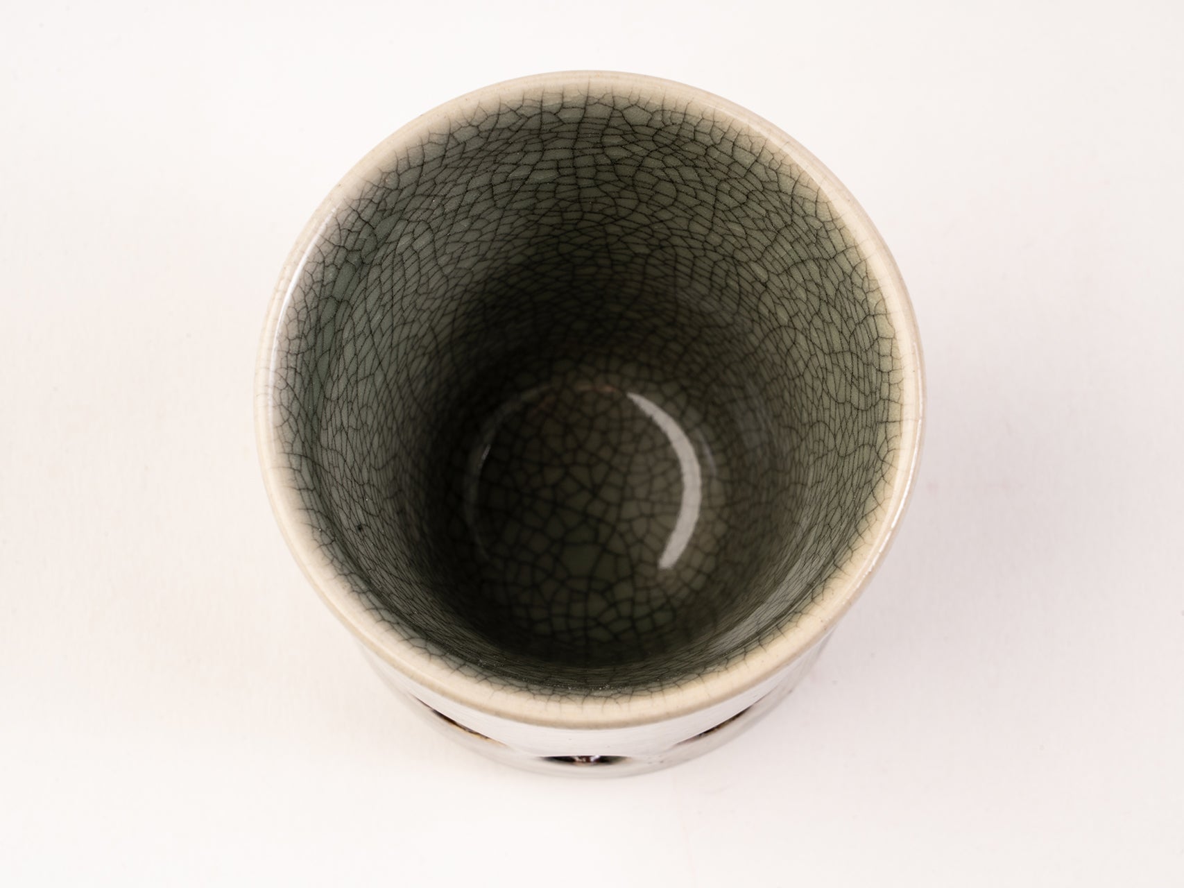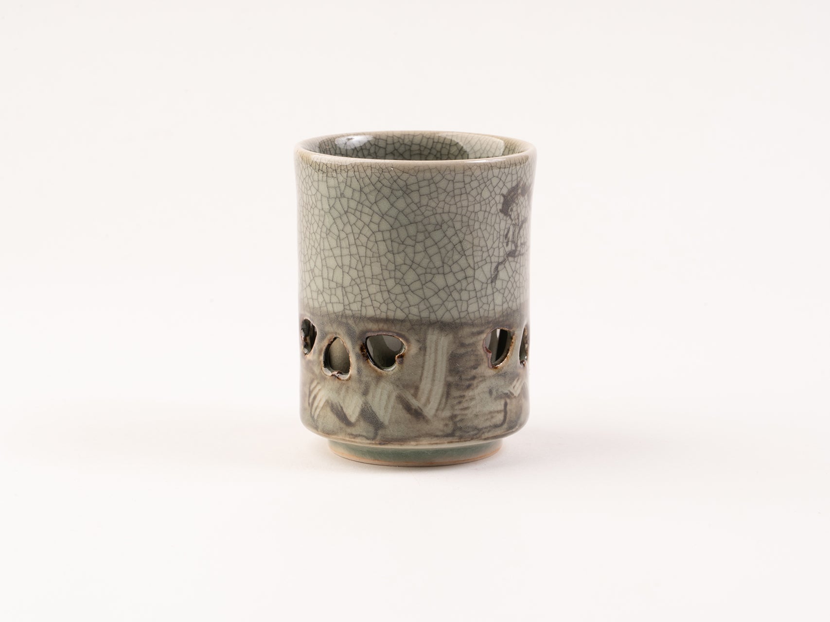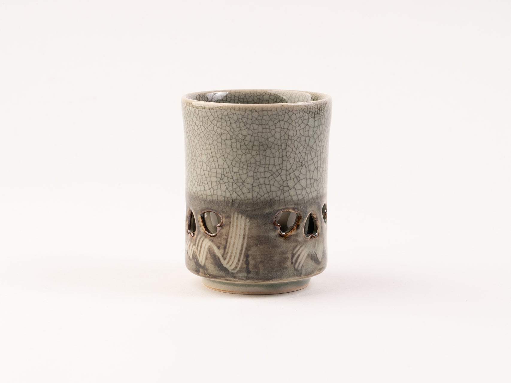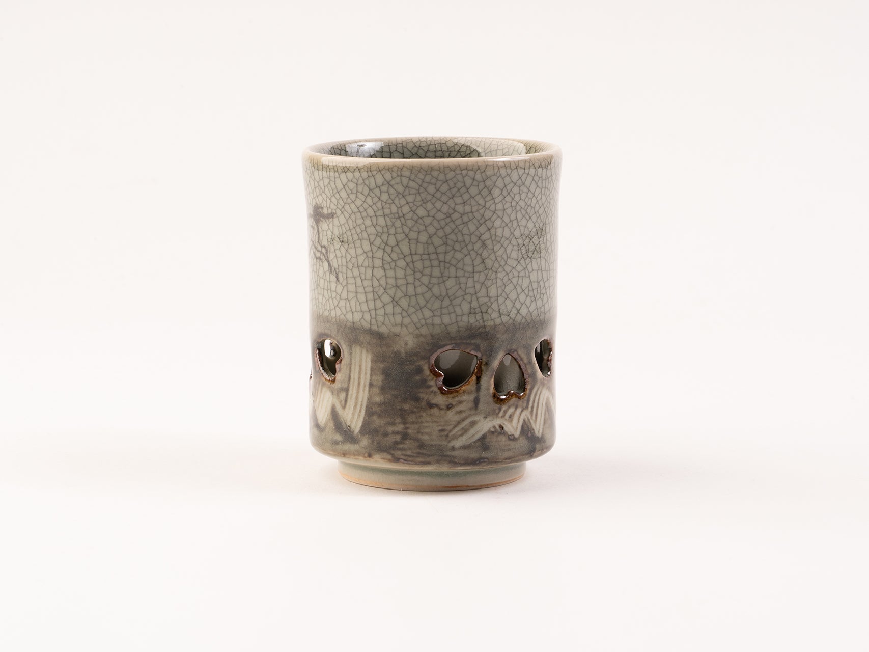 大堀相馬焼の特徴である「青ひび」「走り駒」「二重焼」が全て凝縮された定番の作品となっています。渋い色使い、その中で彩る「走り駒」は350年の伝統を感じさせるのではないでしょうか。二重焼のため、お湯が冷めにくく、お湯の熱さも手に伝わりにくくなっております。陶器の原料である粘土の中にも小さな空気の粒が含まれているため、保温・保冷効果がガラスより高いのも特徴です。
