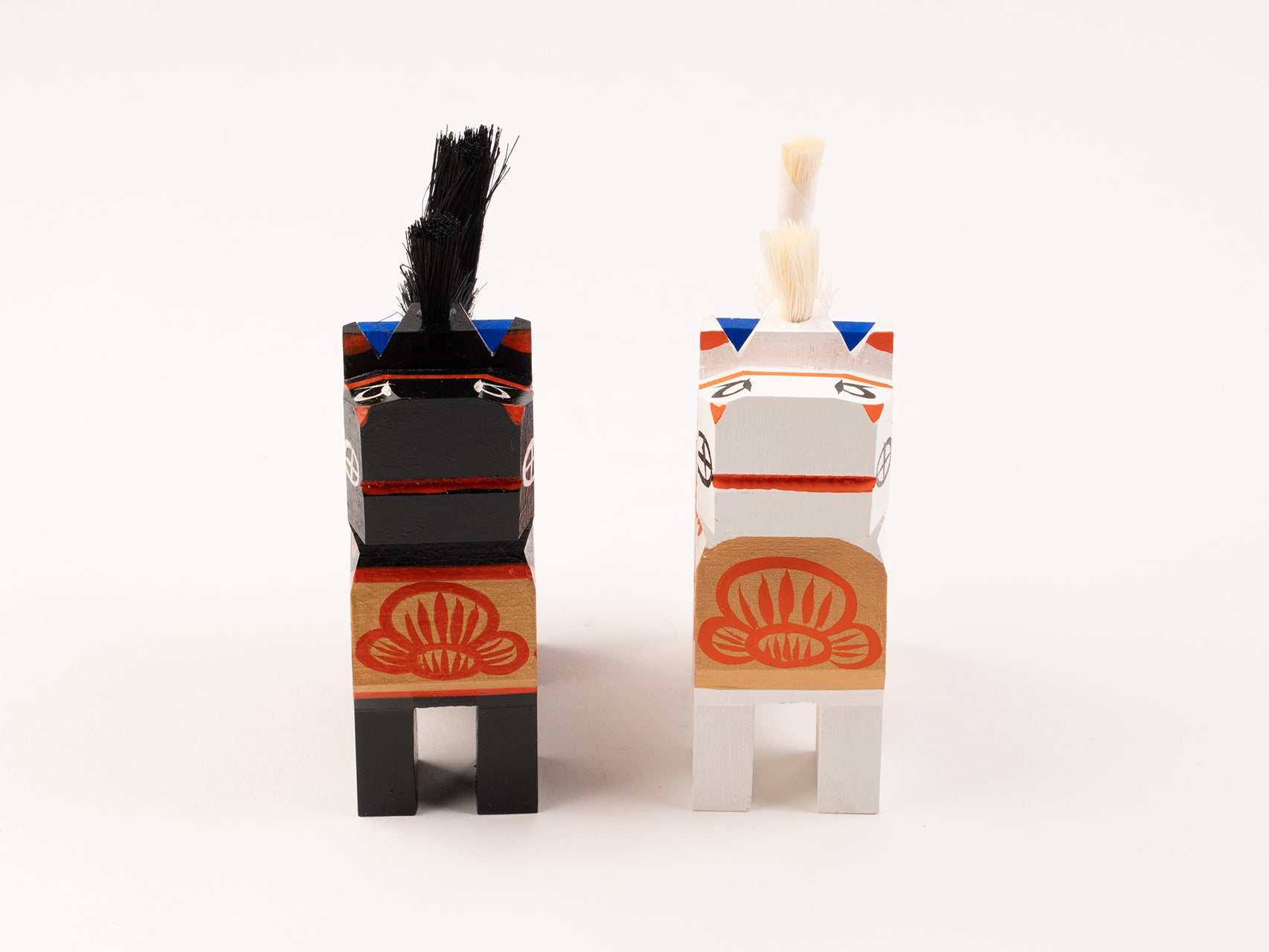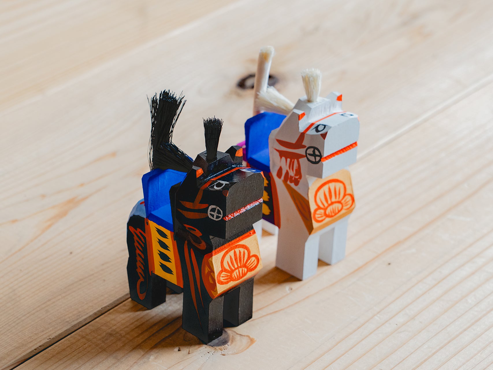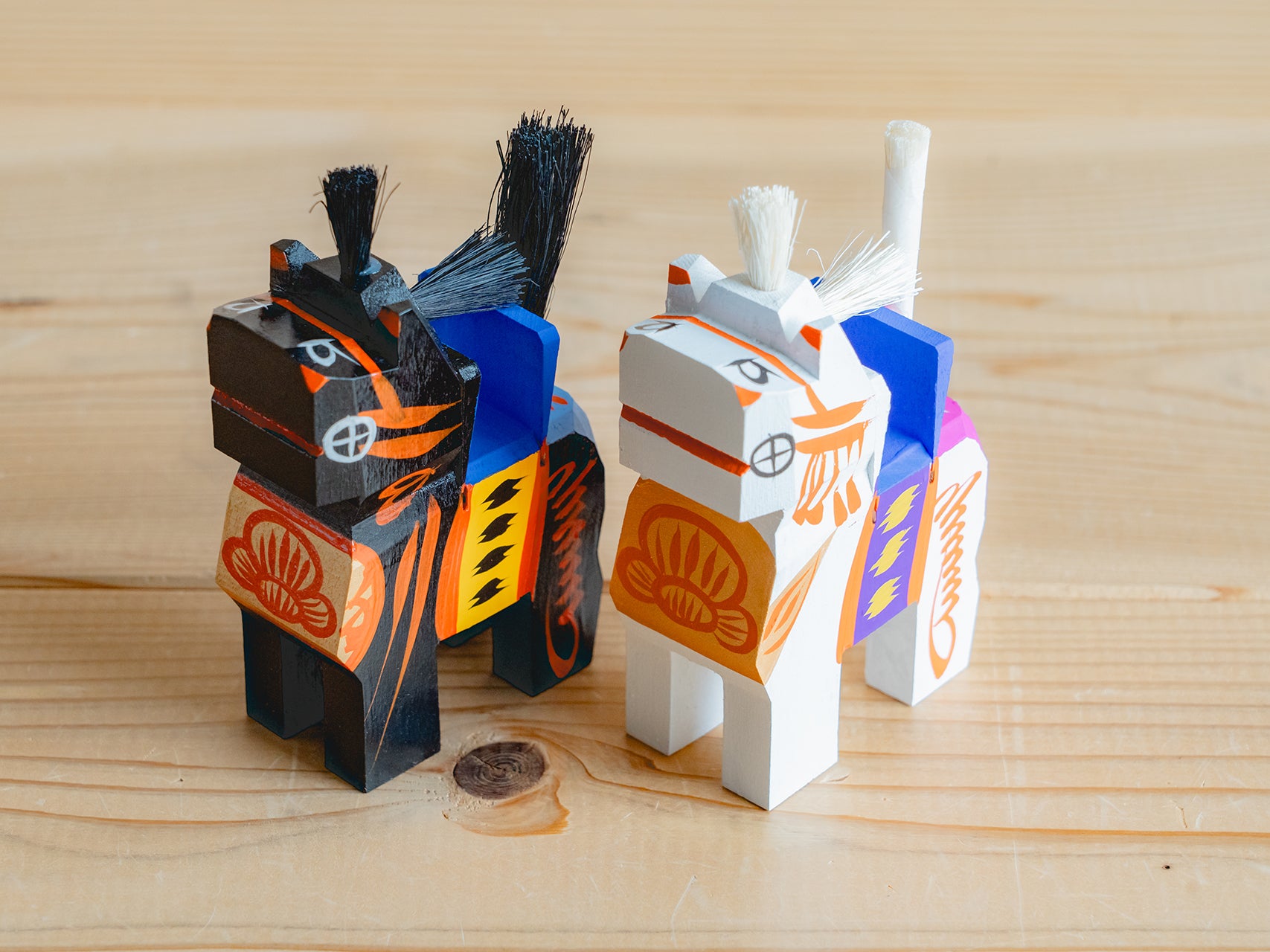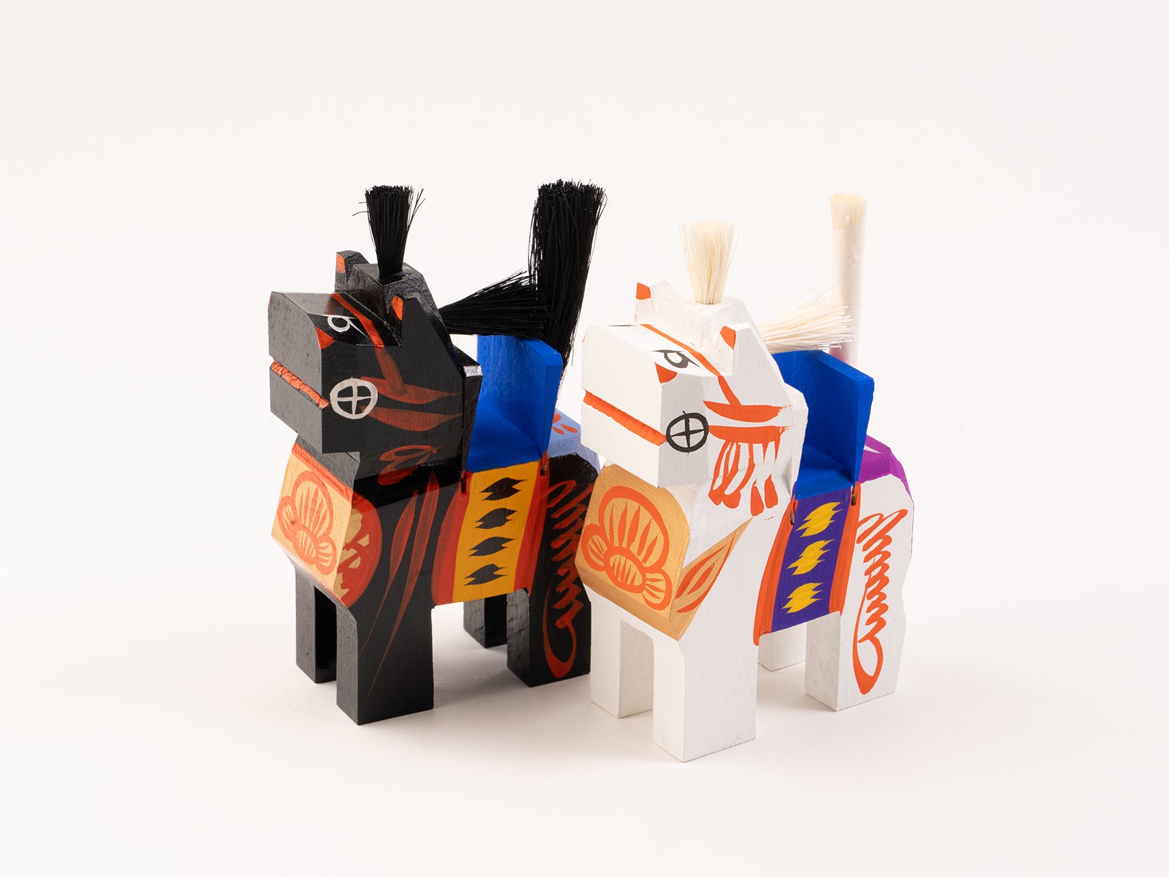 福島県は江戸時代より、全国的に有名な馬の産地となりました。そしてこの馬をモチーフに作られはじめたのが郷土玩具の三春駒(みはるごま)です。黒色が子供のお守り、白色がお年寄りのお守りと言われる縁起物です。