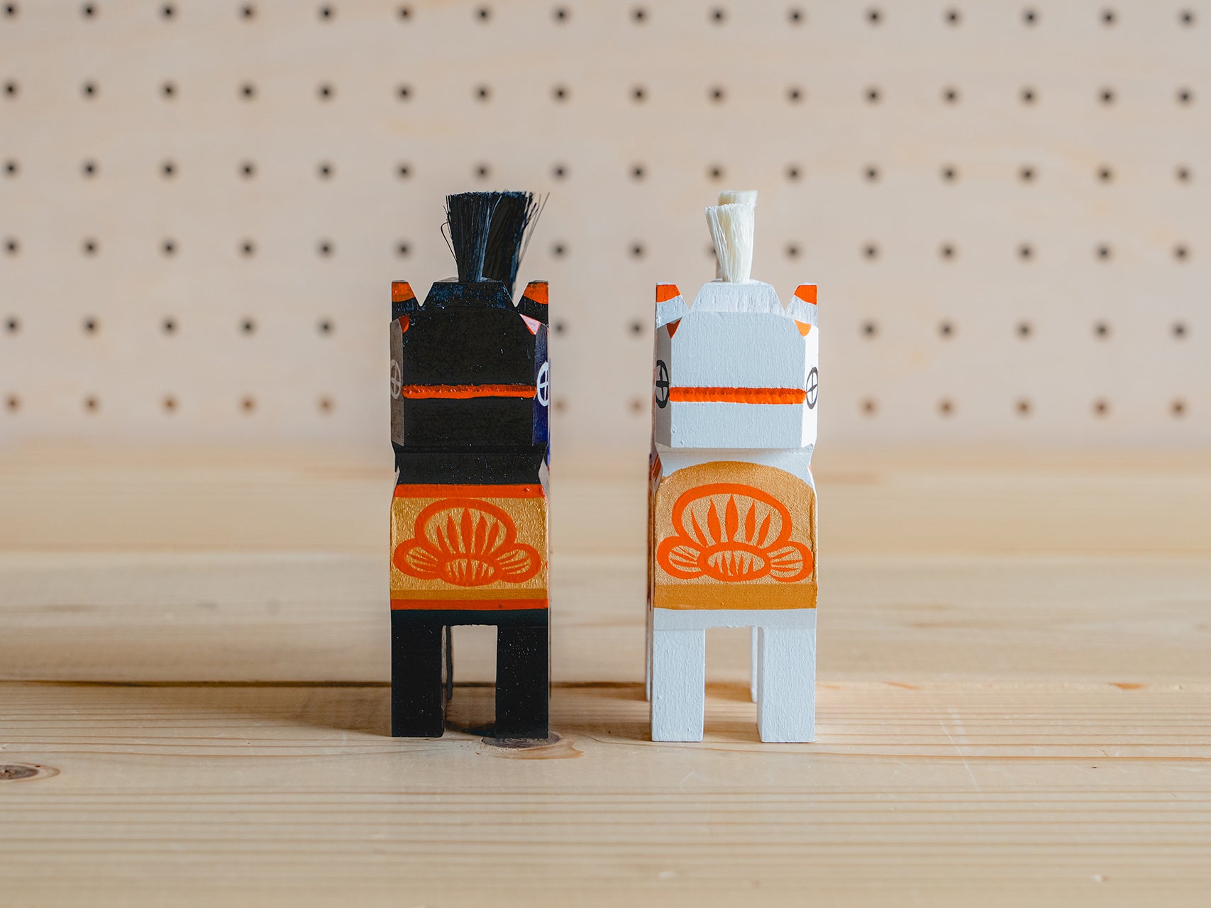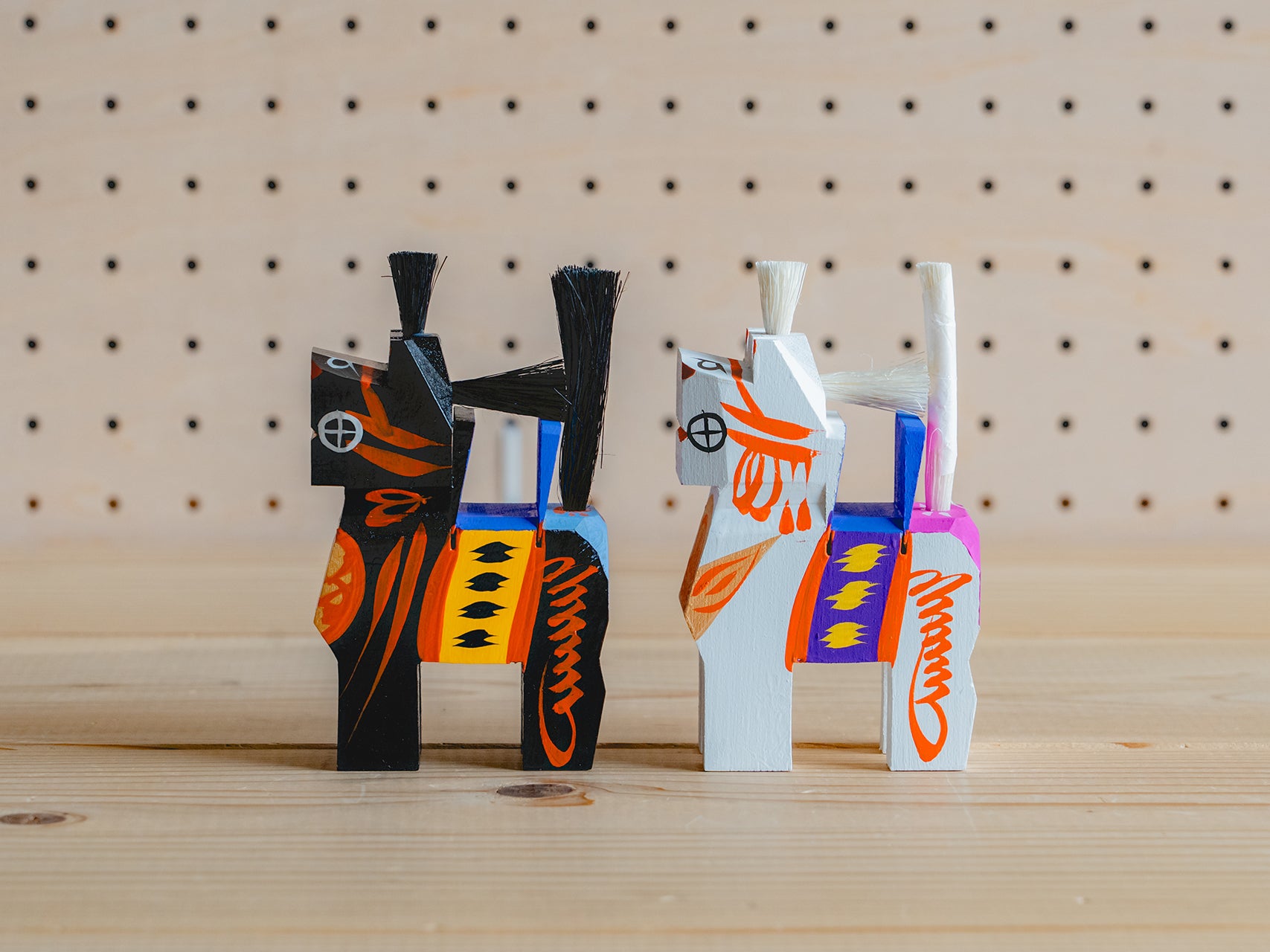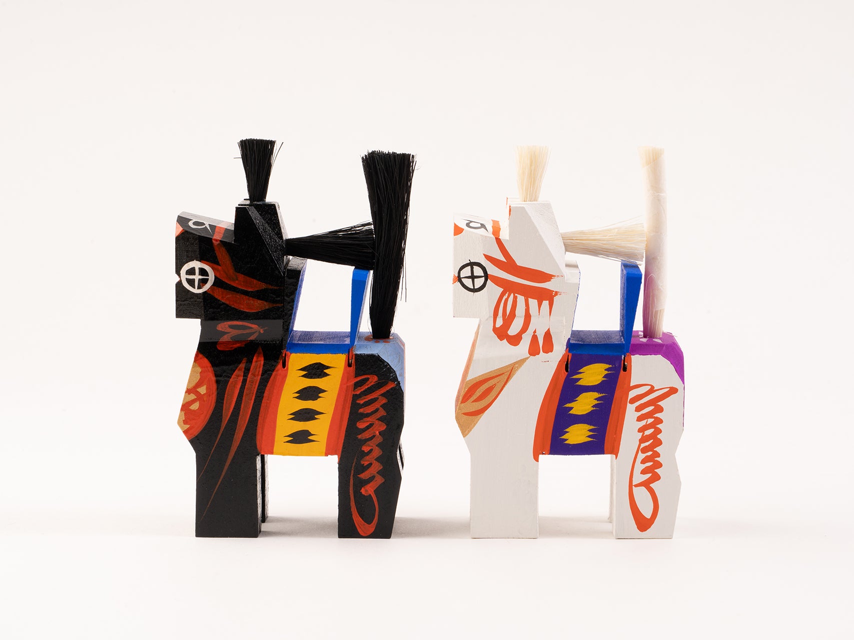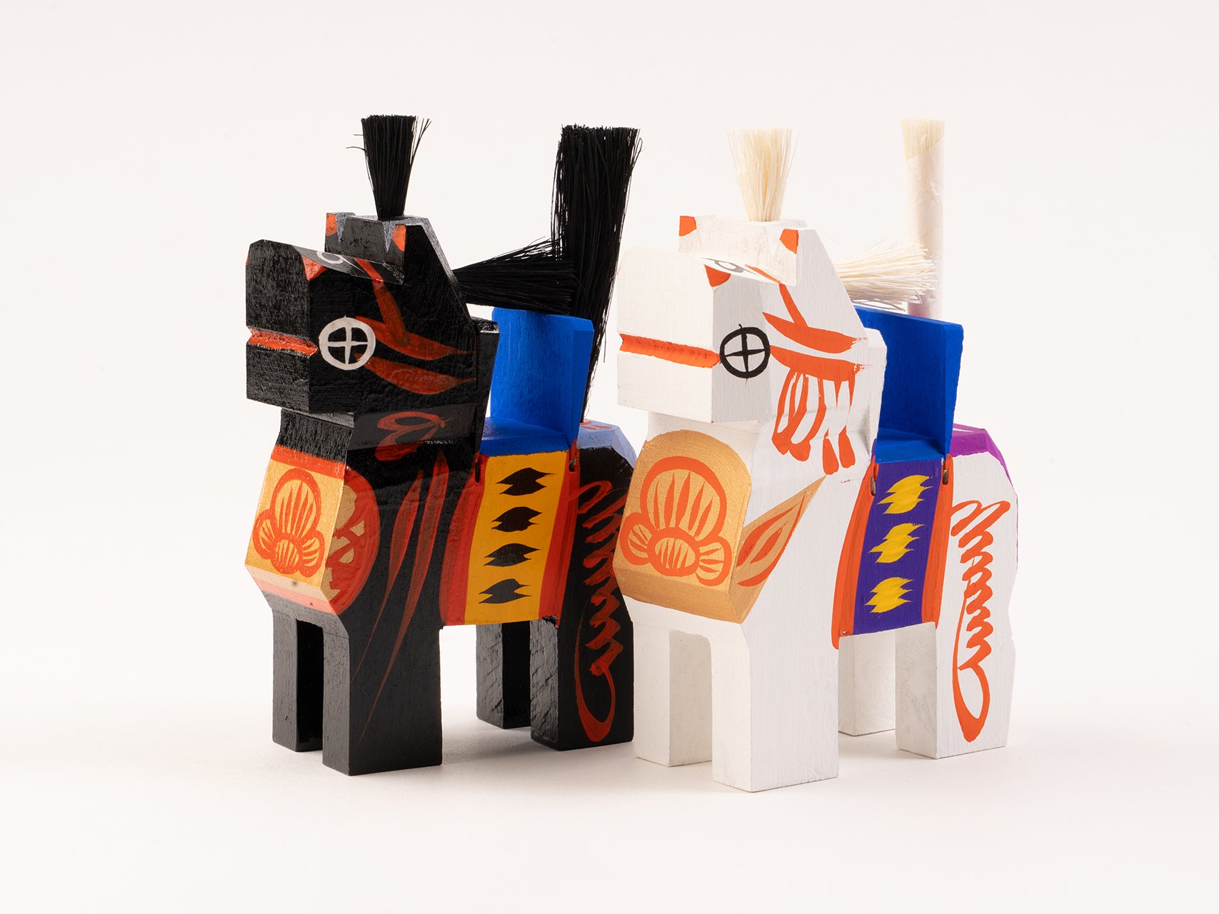福島県は江戸時代より、全国的に有名な馬の産地となりました。そしてこの馬をモチーフに作られはじめたのが郷土玩具の三春駒(みはるごま)です。黒色が子供のお守り、白色がお年寄りのお守りと言われる縁起物です。