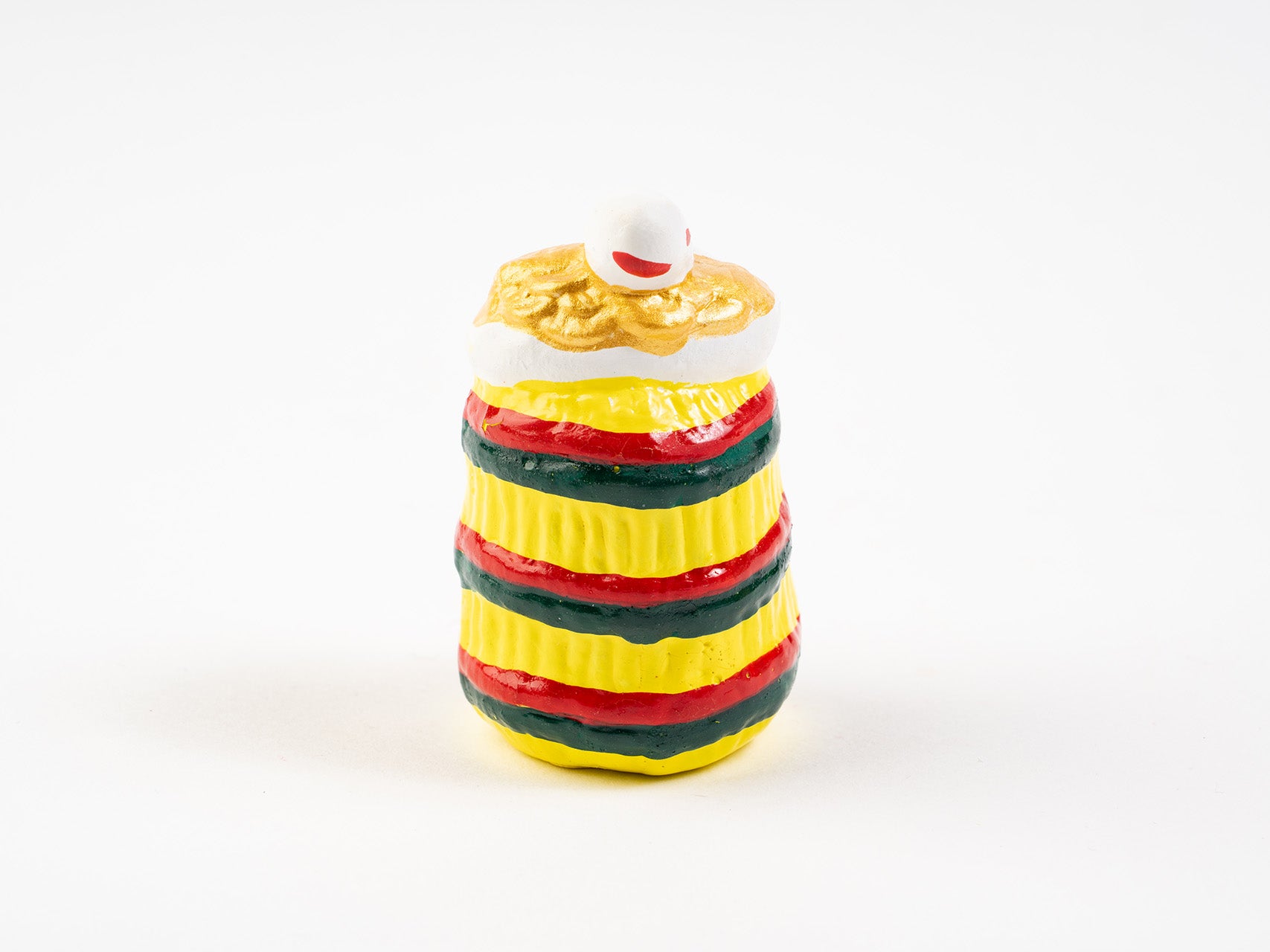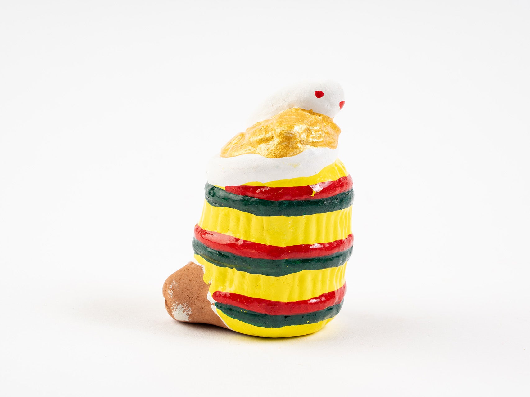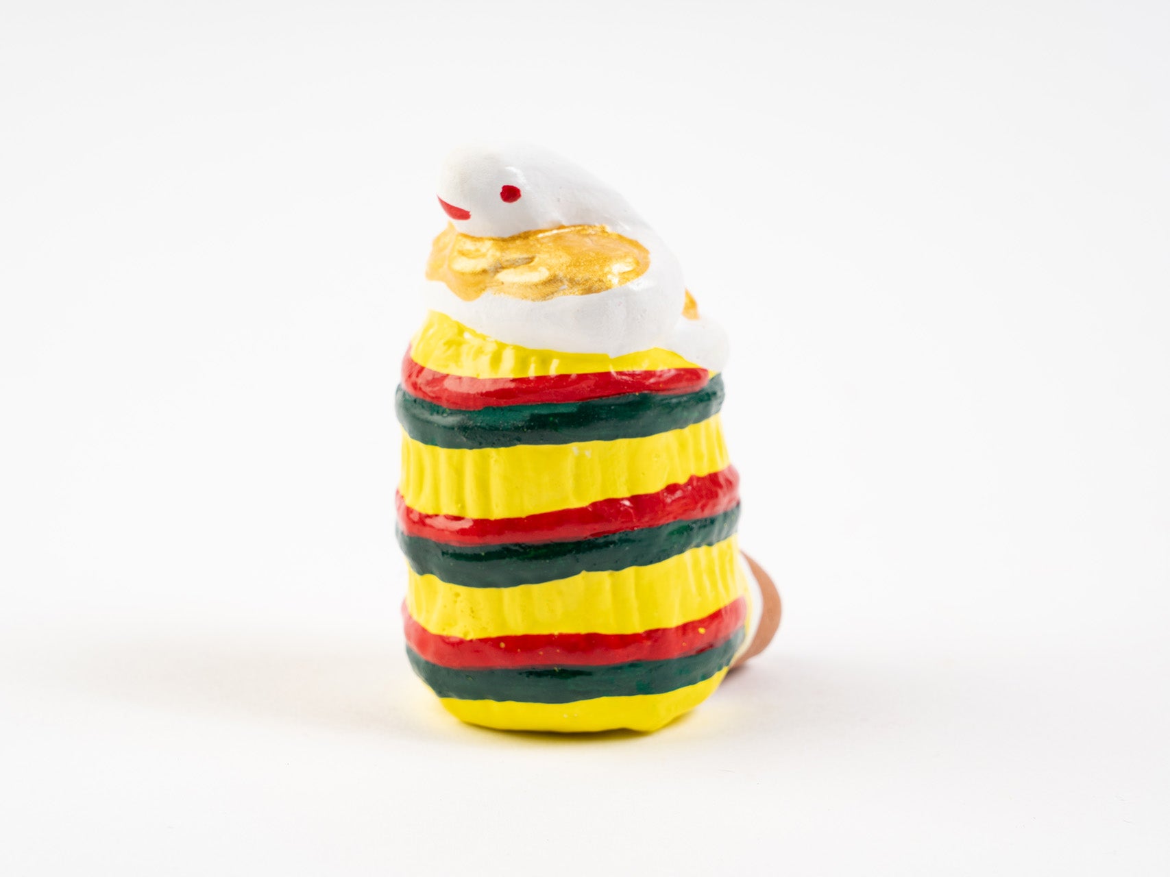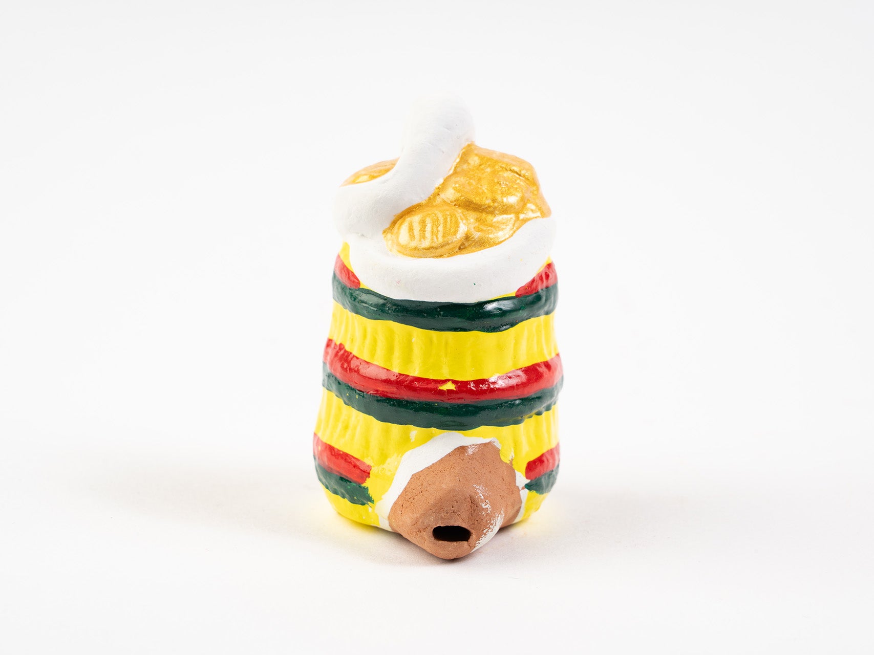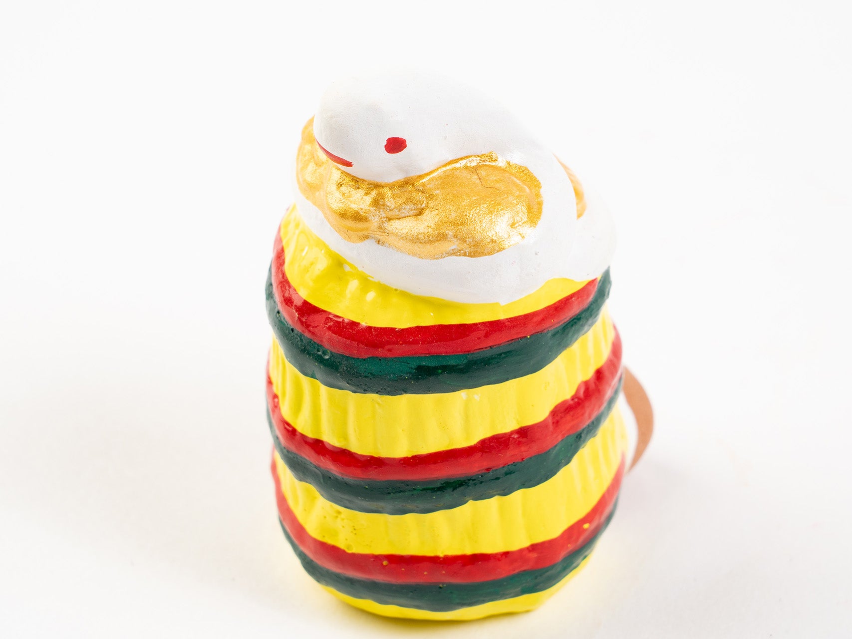 青森県の伝統工芸品、下川原焼土人形の小判抱き蛇笛です。笛になっているため吹いて遊ぶことができます。